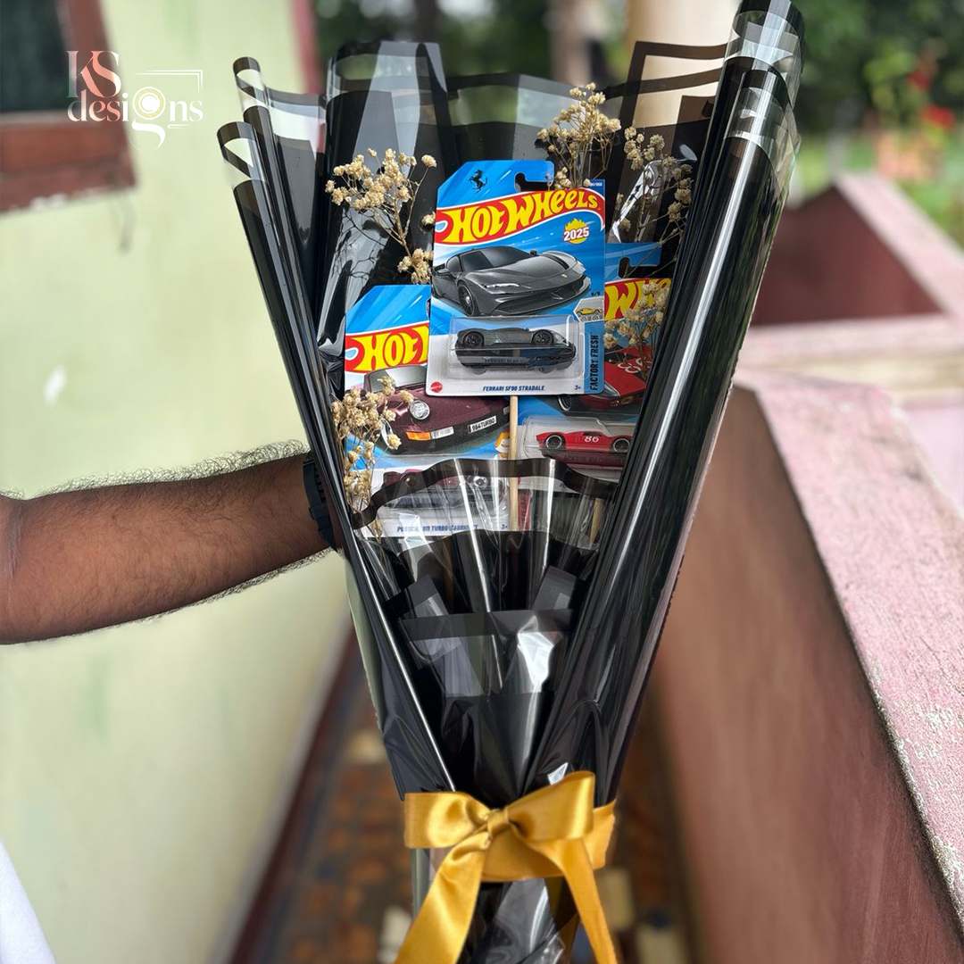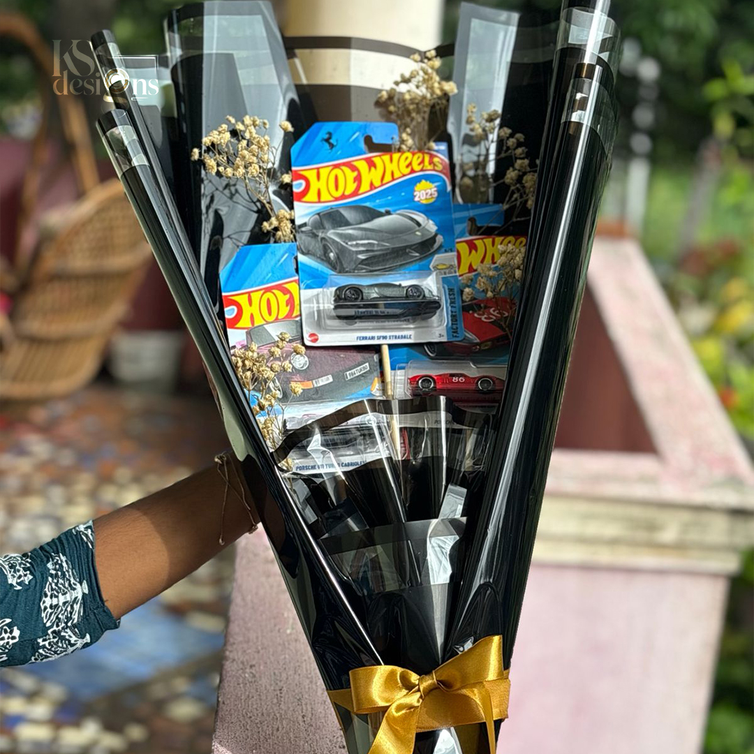 The Hot Wheels Bouquet – Large is a premium and eye-catching gift designed for true Hot Wheels lovers. This large bouquet comes with multiple original Hot Wheels cars, artistically arranged in elegant black wrapping and enhanced with dried floral accents and a golden ribbon finish.
