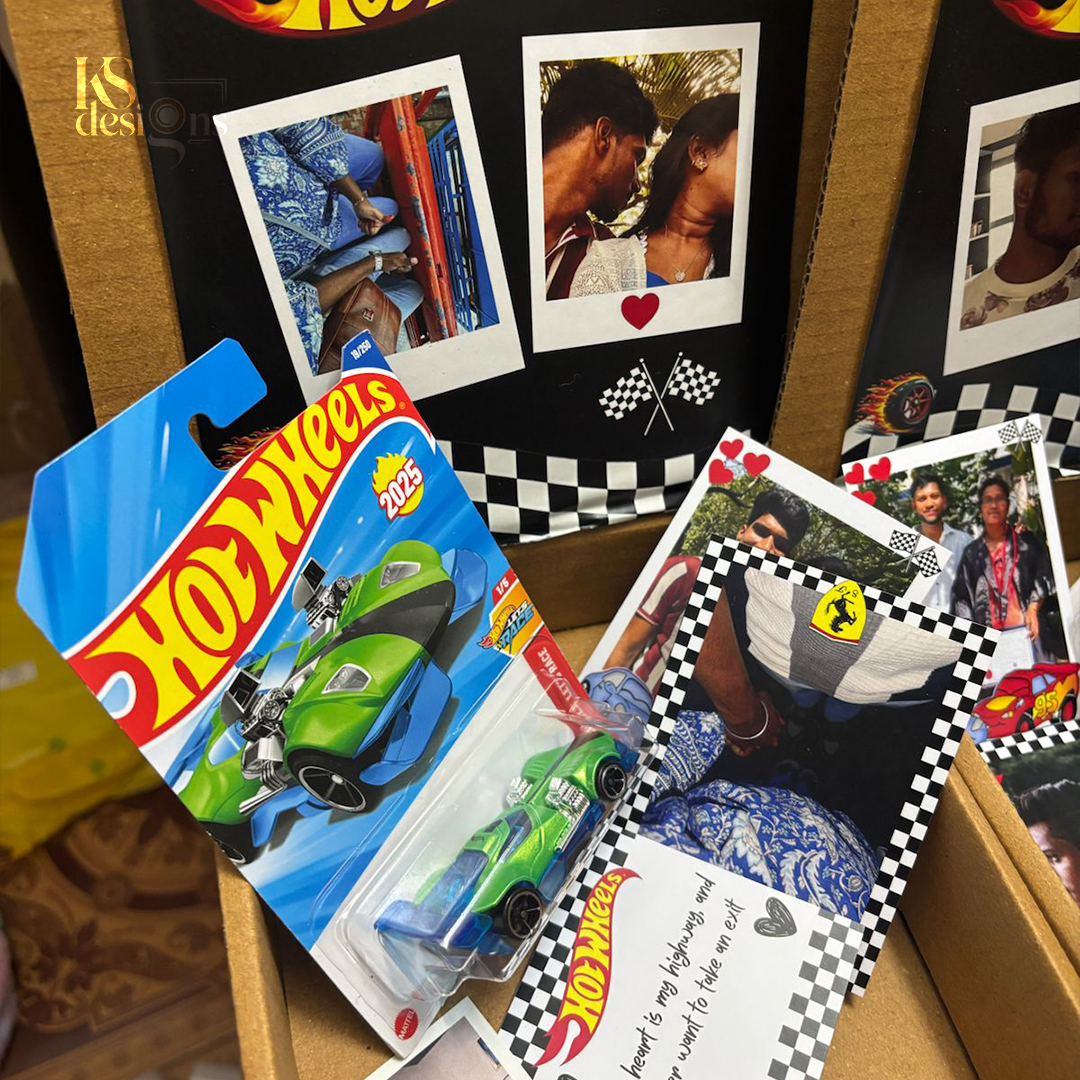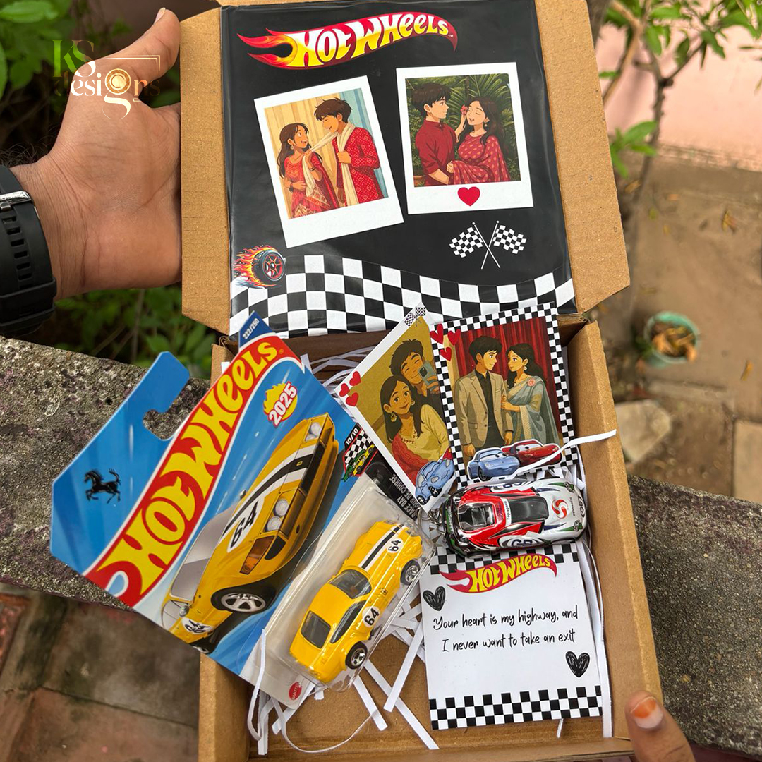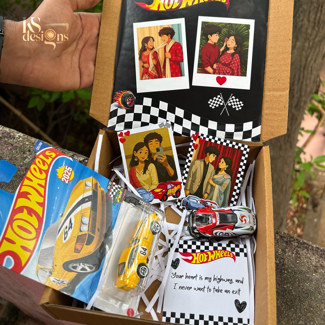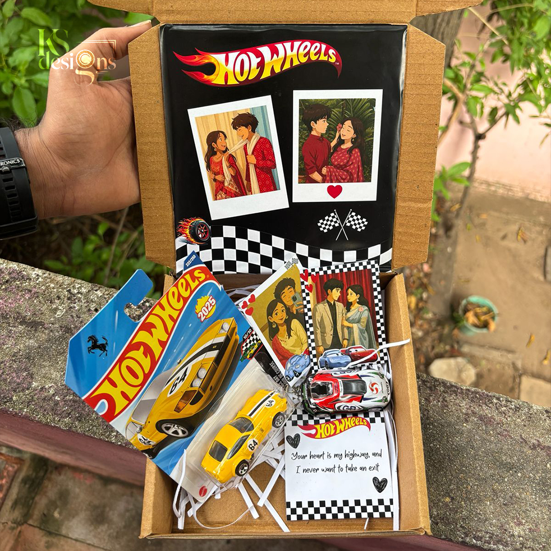 The Hot Wheels Combo Gift Box is a creative and budget-friendly gift option designed for kids, couples, and Hot Wheels lovers. This combo brings together the excitement of original Hot Wheels toy cars with cute illustrated couple cards and a sweet printed message note, all packed neatly in a premium gift box.
